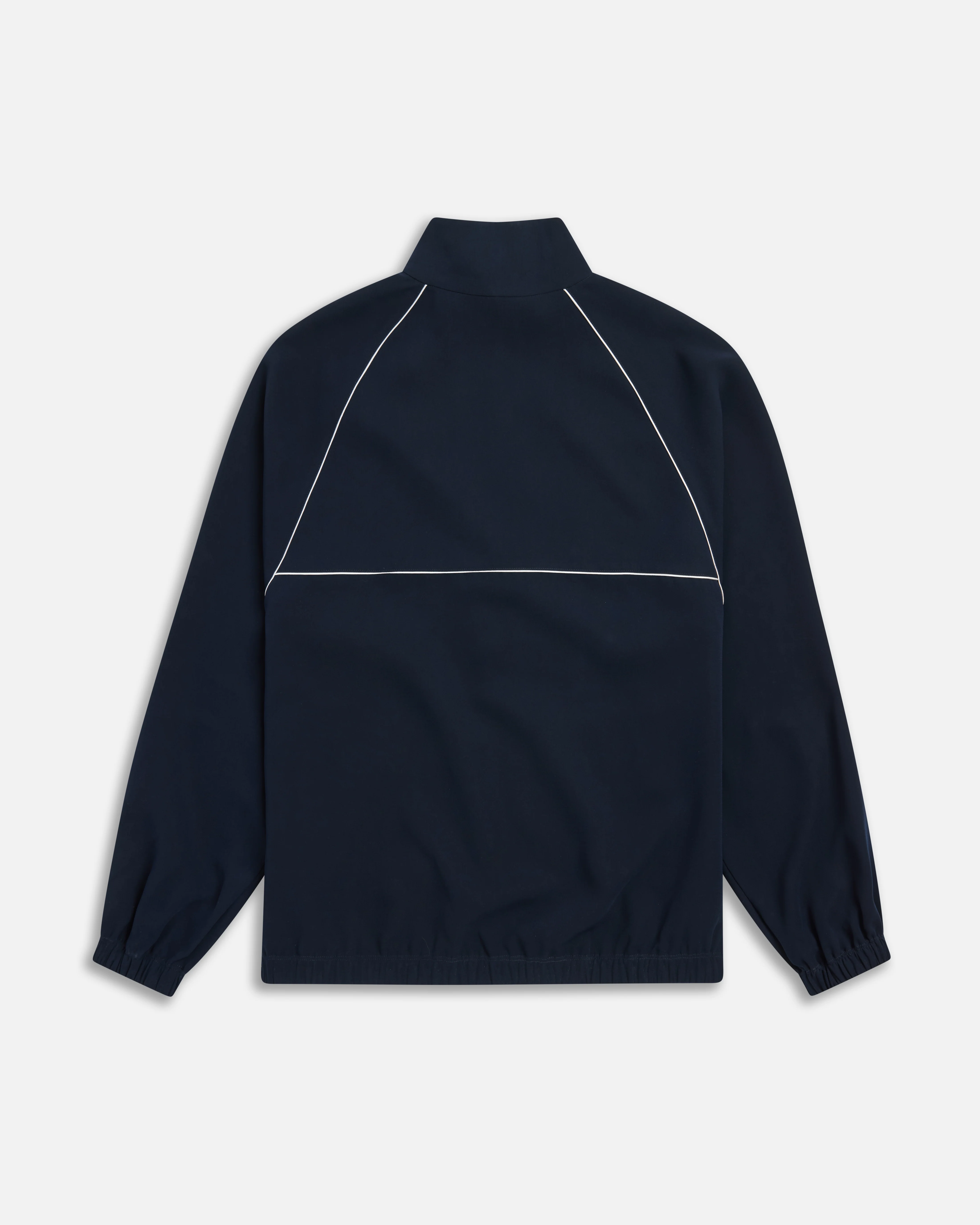 Modern track jacket with raglan sleeves, center zip closure, zippered welt pockets, and satin piping across the chest, sleeves, and yoke. Lightweight and streamlined.