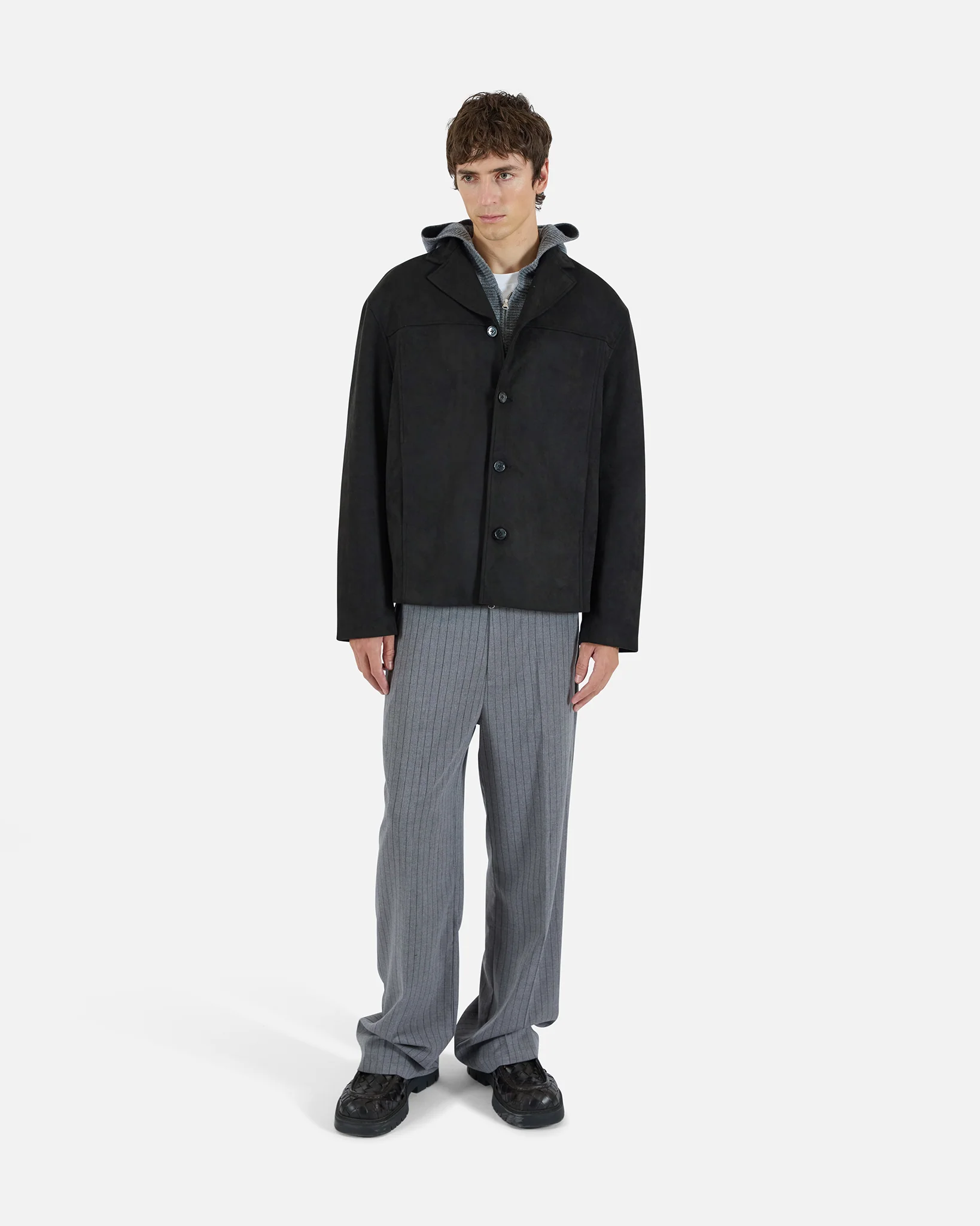 A refined take on a transitional staple, the Suede Lapel Jacket in black features a notched lapel, four-button front closure, and discreet seamed pockets. Fully lined for added comfort, the soft faux suede texture elevates the everyday jacket with a tailored edge.